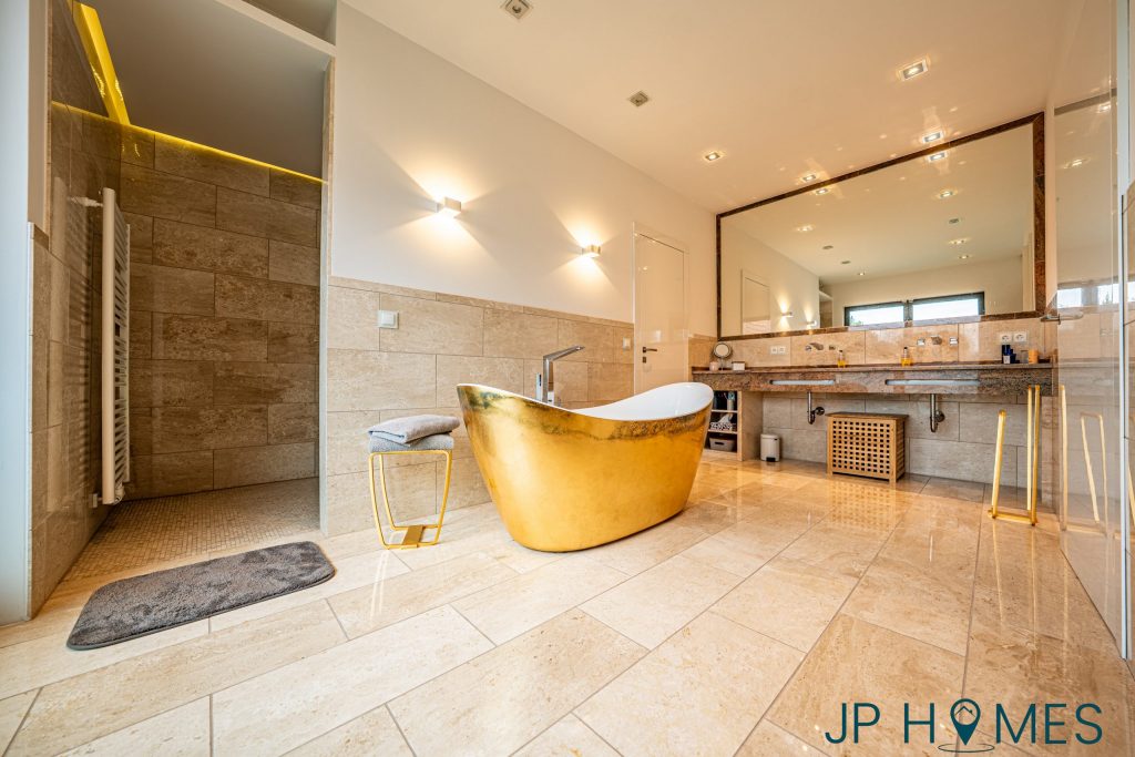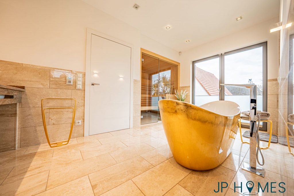 • Badezimmer OG: 2 Waschbecken aus Granit Kashmir, freistehende Badewanne mit Blattgoldveredelung, bodengleiche Regendusch, Sauna für 6 Personen, separates WC